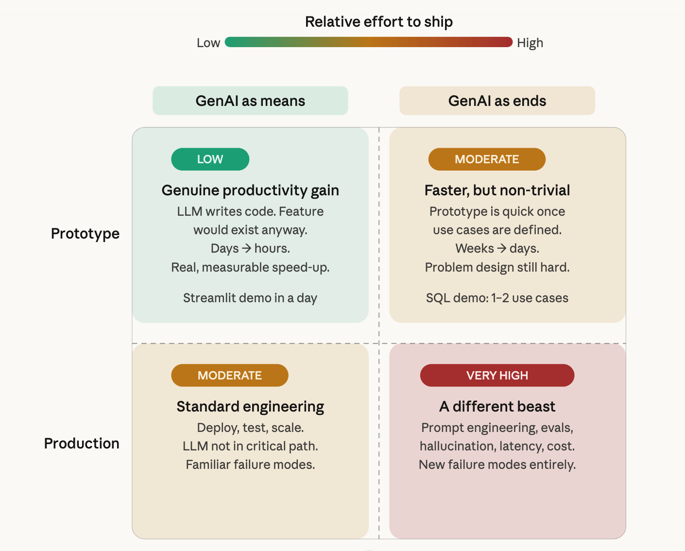 The next time someone shares a productivity stat about GenAI, it is worth pausing for a second. Which kind of productivity? A coding assistant helping ship a search bar is a real gain, no argument there. But if the product itself runs on a language model, the prototype was never the hard part. It has never been easier to build one. That is also, unfortunately, the easiest part of the whole lifecycle.