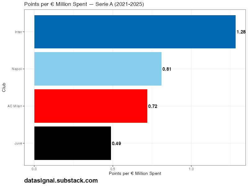 At 1.28 points per €1M spent, Inter is by far the most efficient club, getting nearly 60% more value than the second-best team. Juventus's €559M investment has yielded the worst value for money.