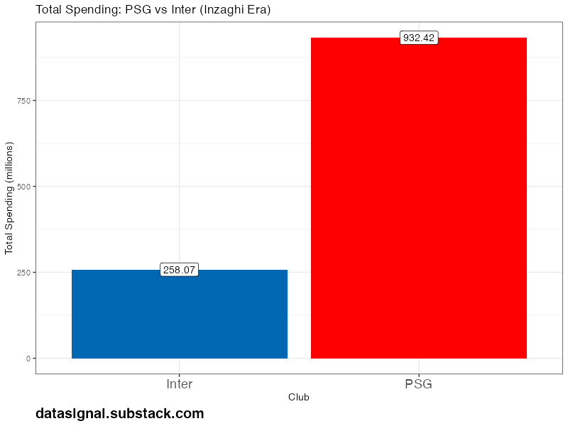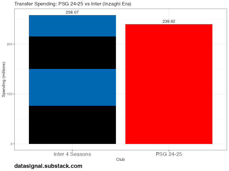PSG's total spending has been almost 4x what Inter spent. But this doesn't tell the full story. Let's provide more context between the two sides. PSG's spending for 2024-25 alone (not even their highest spending year):