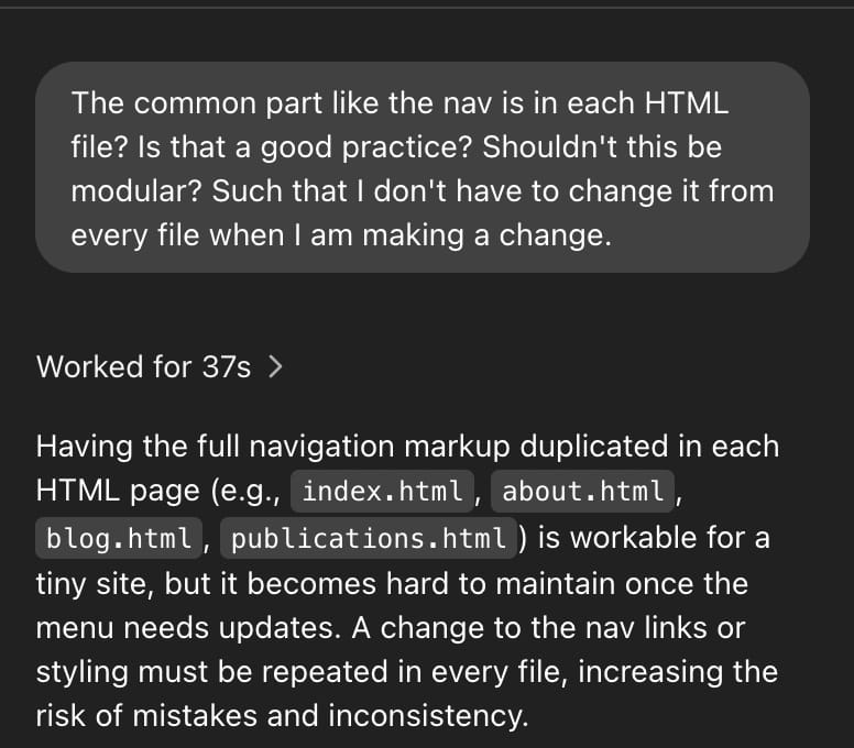 I am not a software engineer in any shape or form. I just have a basic understanding because of my work, and that proved to be quite crucial in this whole exercise. The biggest hurdle I found while doing vibe-coding was that the code wasn’t modular enough most of the time. I had to give constant nudges like this: