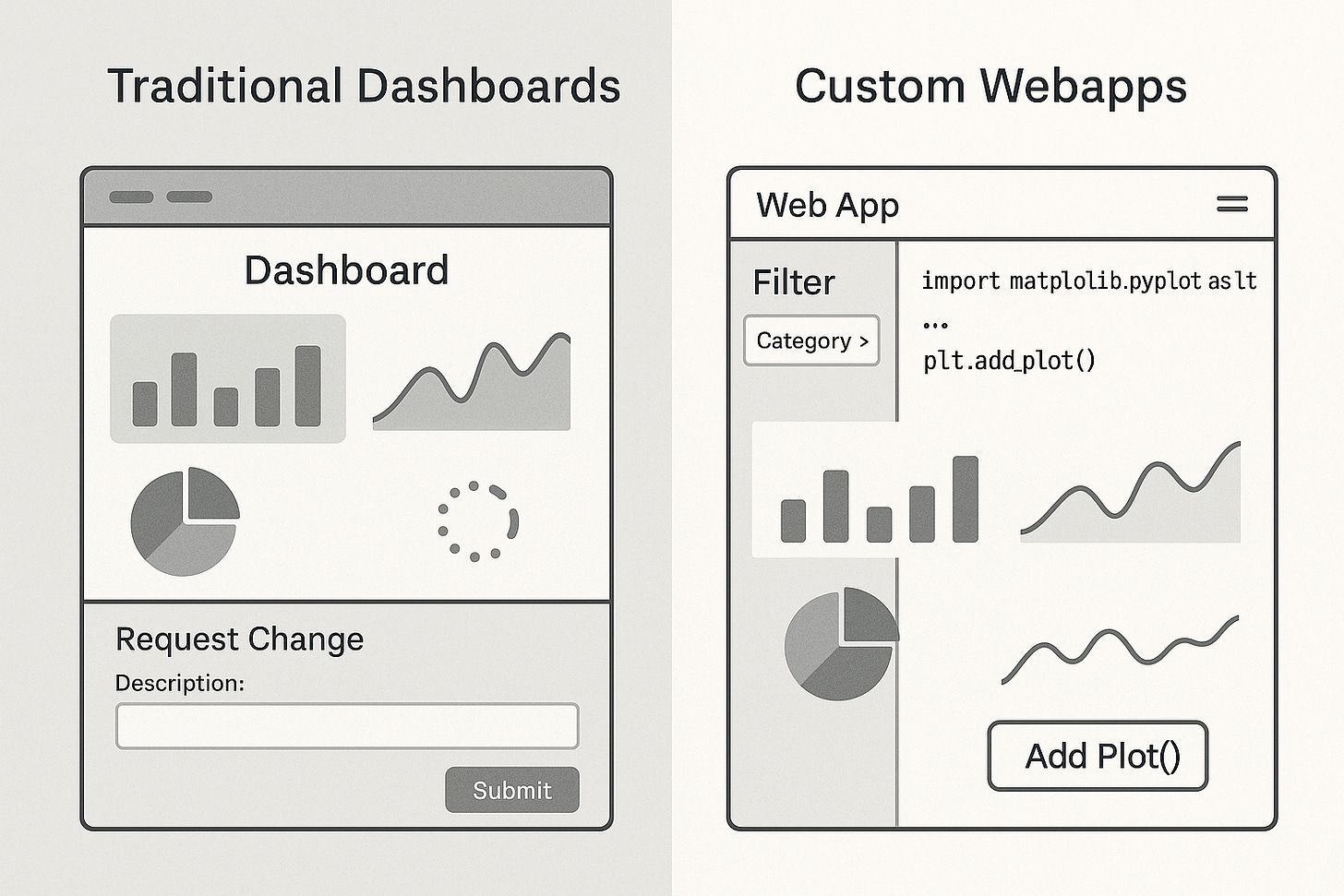 When it comes to webapps, the typical tools used by DS teams are R Shiny or Streamlit (for Python). These require more coding effort, unlike the low-code/no-code experience of traditional BI dashboards. That said, I’ve grown to appreciate webapps more - especially in this GenAI era, where writing code is no longer a bottleneck.