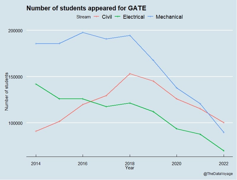 The trend shows that the number of students appearing for GATE is steadily decreasing since 2018. In just four years, from 2018 to 2022, the number of Mechanical candidates has dropped by half. Civil and Electrical branches are also seeing a decline. And I think this is a positive sign.