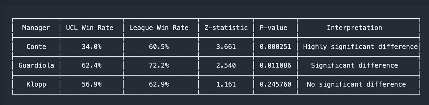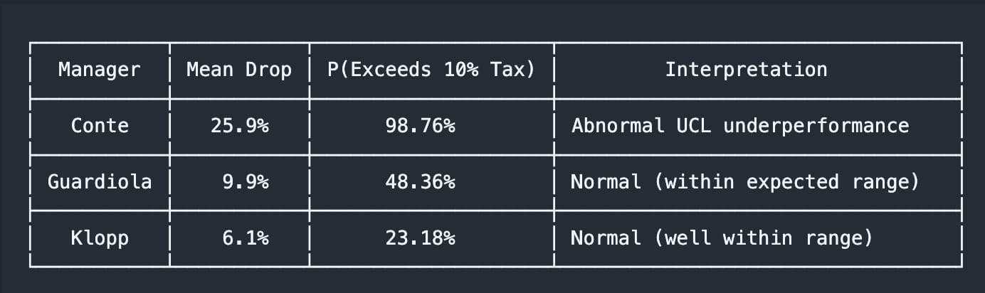 While all three managers show some performance difference between competitions (as they should - the UCL is harder), only Conte’s gap is abnormal after accounting for the increased difficulty. Pep and Klopp are performing within the expected range for elite managers facing elite opposition.
