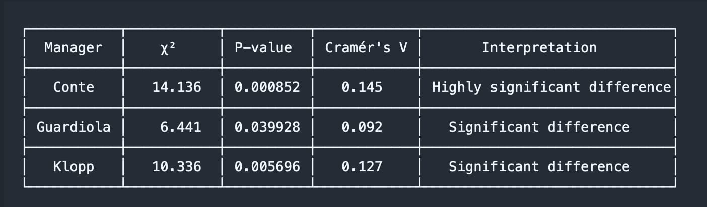 The Chi-square test helps us understand if the entire result pattern changes, not just the win rate. And interestingly, even Klopp shows a significant difference here despite his Z-test being non-significant. This suggests his teams play differently in Europe (fewer draws, more decisive results), even though his overall win rate stays similar.