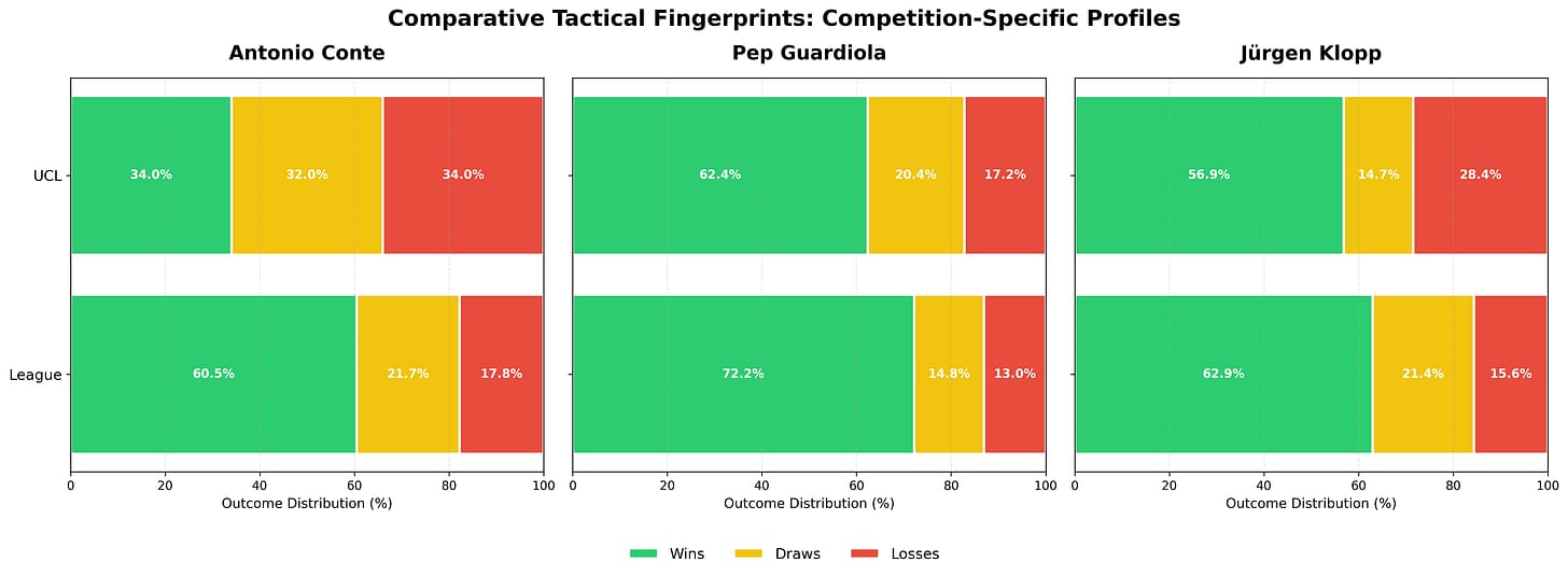 In the first section, we looked at winning % only. Now, let’s examine the complete tactical profile - how the full distribution of wins, draws, and losses shifts between competitions.