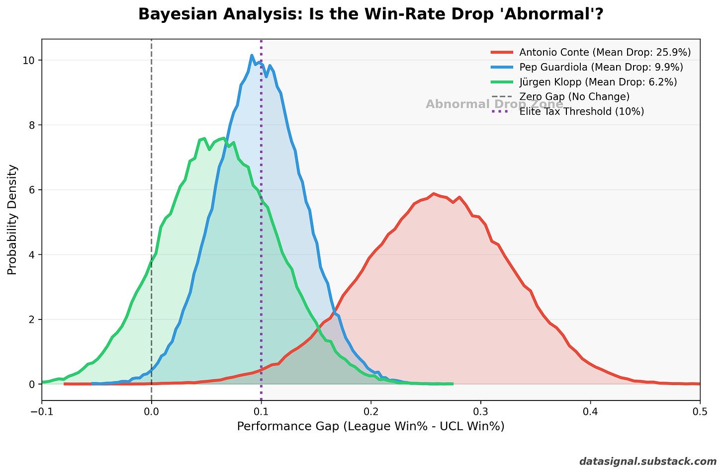 How to read the plot: Don’t just look at the peaks of the curves. Look at where they don’t overlap. Pep and Klopp’s performance distributions live in the same neighborhood. Conte’s distribution doesn’t even have a view of their street.